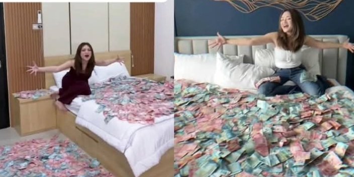 Unggahan Nathalie di akun Instagram pribadinya menunjukkan suasana pesta yang megah, lengkap dengan “hujan saweran” dan ranjang kamar yang dipenuhi lembaran uang tunai.
