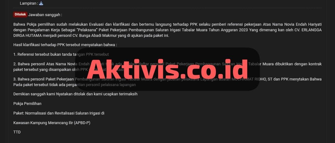 Menindaklanjuti arahan itu, perusahaan mengajukan sanggahan resmi dengan melampirkan surat pernyataan tertulis dari PPK yang menegaskan bahwa referensi pekerjaan tersebut benar dan sah. Namun, dalam jawaban sanggahan, Pokja justru tetap mempertahankan keputusan awal tanpa memberikan ruang klarifikasi lanjutan.