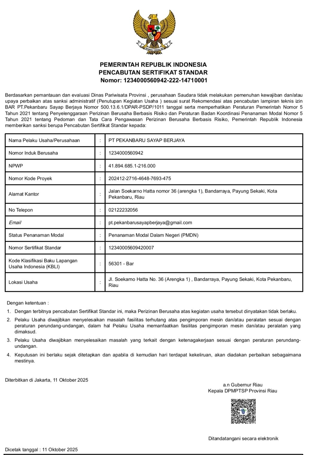 Dengan demikian, sertifikat standar dan perizinan berusaha PT Pekanbaru Sayap Berjaya dinyatakan tidak berlaku lagi.