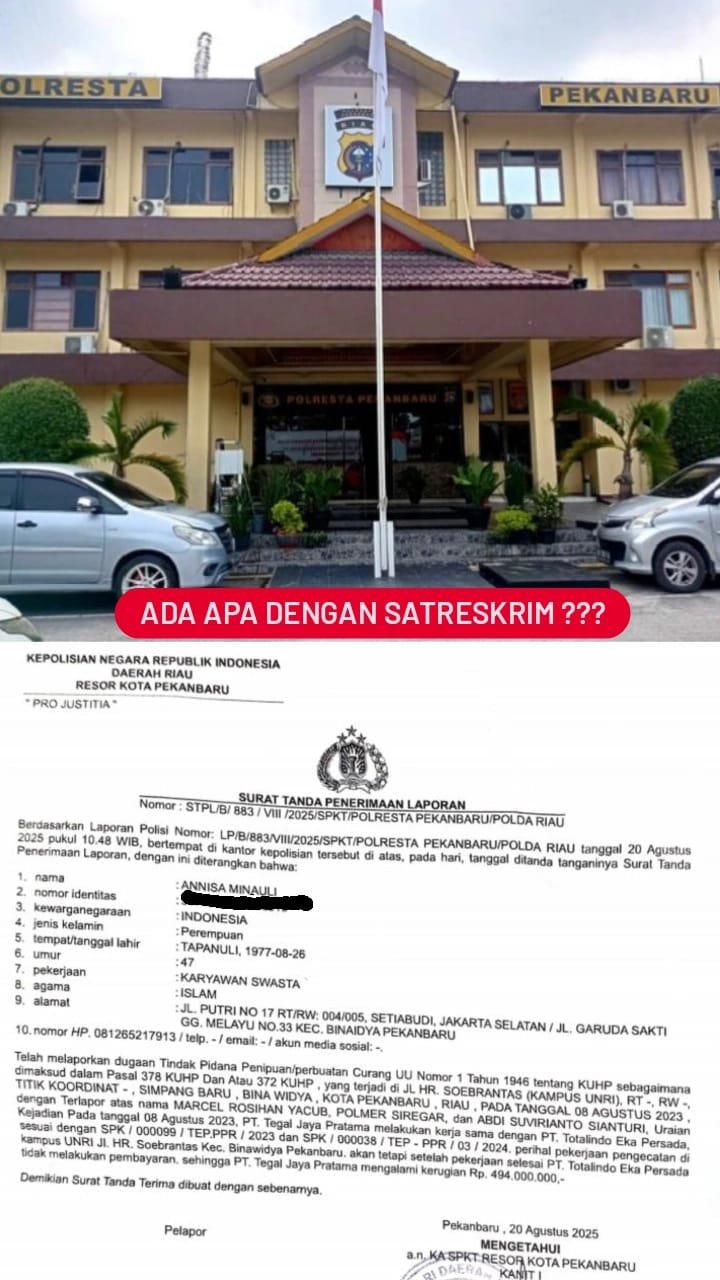 Pekanbaru, aktivis.co.id – Penanganan kasus dugaan penipuan atau perbuatan curang sebagaimana diatur dalam Pasal 378 dan/atau Pasal 372 KUHP terkait proyek CWR 02 Universitas Riau, dengan nilai kerugian sebesar Rp 494.000.000, dinilai berjalan sangat lambat. Pelapor, Annisa Minauli, mempertanyakan komitmen penyidik Jatanras Satreskrim Polresta Pekanbaru yang hingga kini belum juga menggelar perkara, meskipun telah dilakukan tiga kali pemanggilan terhadap para terlapor.