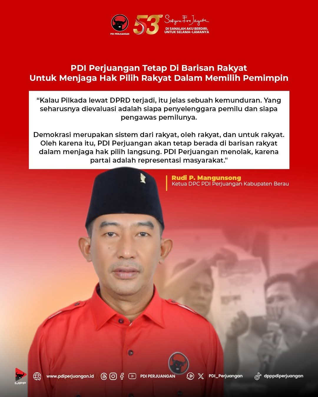 Ketua DPC PDI Perjuangan Kabupaten Berau, Rudi P. Mangunsong, menegaskan bahwa efisiensi anggaran kerap dijadikan dalih yang keliru untuk membenarkan pengurangan hak politik rakyat.
