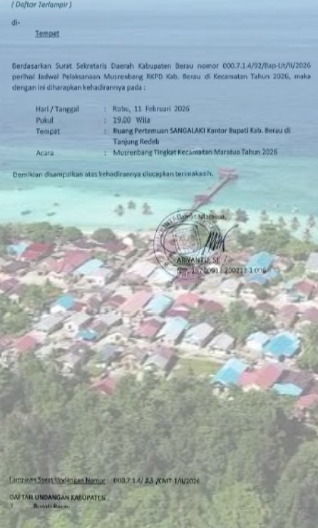 (Aktivis.co.id)Berau,Kaltim- Berdasarkan surat undangan resmi Pemerintah Kabupaten Berau Kecamatan Maratua Nomor 000.7.1.4/23/CMT-1/II/2026 tertanggal 5 Februari 2026, Musyawarah Perencanaan Pembangunan (Musrenbang) Kecamatan Maratua Tahun 2026 dijadwalkan berlangsung pada Rabu, 11 Februari 2026, pukul 19.00 Wita, bertempat di Ruang Pertemuan Sangalaki, Kantor Bupati Berau, Tanjung Redeb.